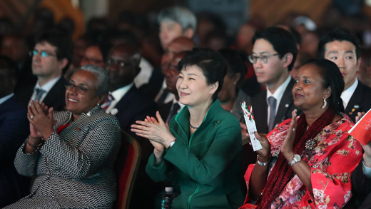 | 박근혜 대통령과 마가레트 케냐타 케냐 영부인(오른쪽)이 5월 31일(현지시간) 열린 ‘한-케냐 문화교류공연’에 참석해 공연을 지켜본 뒤, 박수를 보내고 있다. (사진 = 해외문화홍보원 코리아넷) |