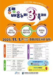 충북 증평군이 내달 1일 오전 10시부터 오후 5시까지 증평군립도서관 일원에서 '2025년 증평 배움누리 3행 축제: 당신의 어제와 내일을 응원합니다'를 개최한다. 배움누리 3행 축제는 ▲나와 함께하는 여행(독서) ▲너와 함께하는 동행(마을교육) ▲우리가 함께 성장하는 비행(평생교육)의 세 가지 뜻을 담아 '김득신 북(Book)페스티벌'과 '온마을배움터 마을학교 축제','평생학습 한마당 축제'를 통합한 대표 학습문화 축제다. 올해 군은 교육부 주관 2025 평생학습도시 재지정 평가에서 전국 상위 10% 우수학습도시로 선정됐으며, 교육발전특구 시범사업 선도 지역으로도 이름을 올렸다. 또한 국립중앙도서관·국회도서관과 국가지식자원 공유 협약을 체결해, 군민 누구나 폭넓은 정보와 지식을 누릴 수 있는 기반을 다졌다. 이러한 성과를 바탕으로 열리는 이번 축제는 '배움으로 성장하는 도시 증평'을 군민과 함께 기념하는 자리로 의미를 더한다. 올해의 주제는 '꿈 - 당신의 어제와 내일을 응원합니다'이다. 행사장에서는 도안면 석곡2리 문해학습자들이 참여한 '북앤아트 그림편지' 교육과정의 결과물 전시와 직접 작성한 편지를 1년 뒤 받아볼 수 있는 '느린 우체통' 체험 프로그램