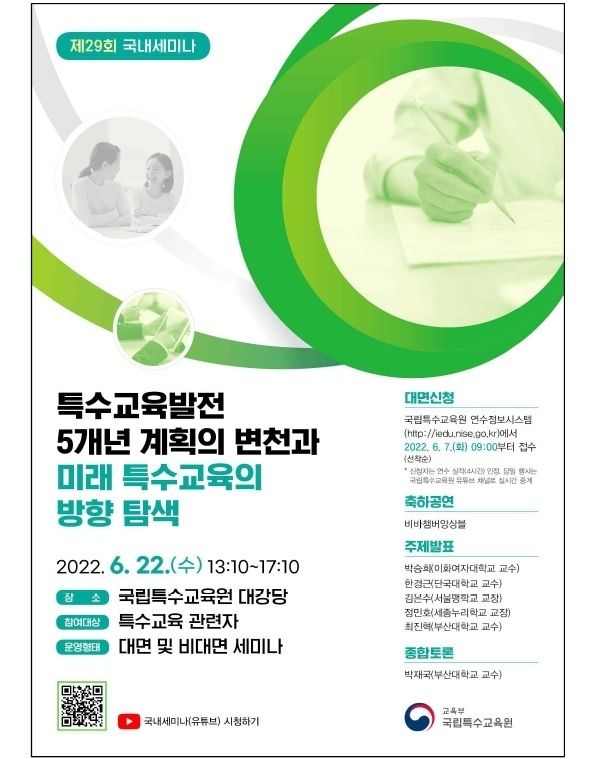 국립특수교육원은 오는 22일 ‘특수교육발전 5개년 계획의 변천과 미래 특수교육의 방향 탐색’을 주제로 제29회 국내세미나를 개최한다고 21일 밝혔다.