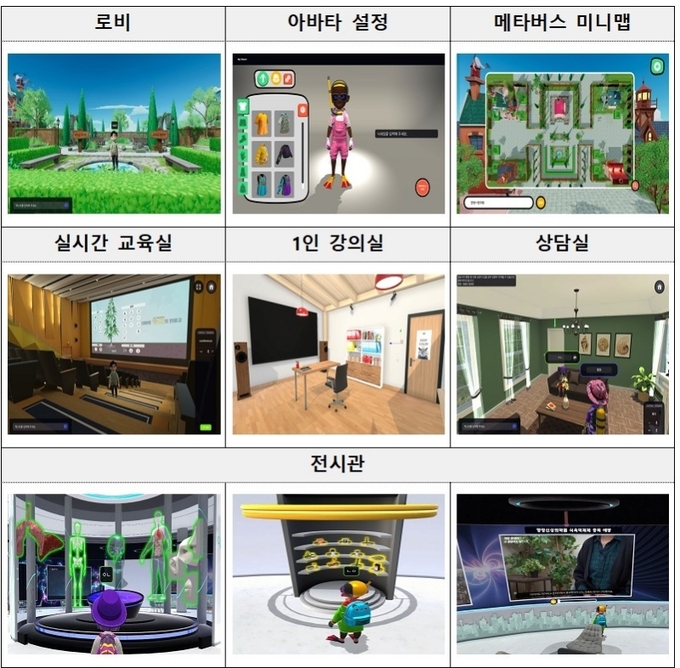 확장가상세계는 ▲비대면 실시간 교육을 위한 교육장 ▲개인 상담을 위한 사이버 공간의 상담실 ▲홍보영상 및 각종 마약류 폐해 정보 전시관 ▲폐해 체감을 위한 가상·증강현실(AR·VR) 콘텐츠관 등으로 구성돼 있다.