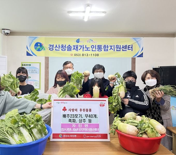 [경산/김근해기자] 자인참사랑나눔터지역아동센터(센터장 박경미)는 지난 3일 자인면 소재 경산청솔재가노인통합지원센터에 배추 23포기, 무 40개, 쪽파 30포기, 상추 등 다양한 채소를 전달하는 나눔 활동을 했다.