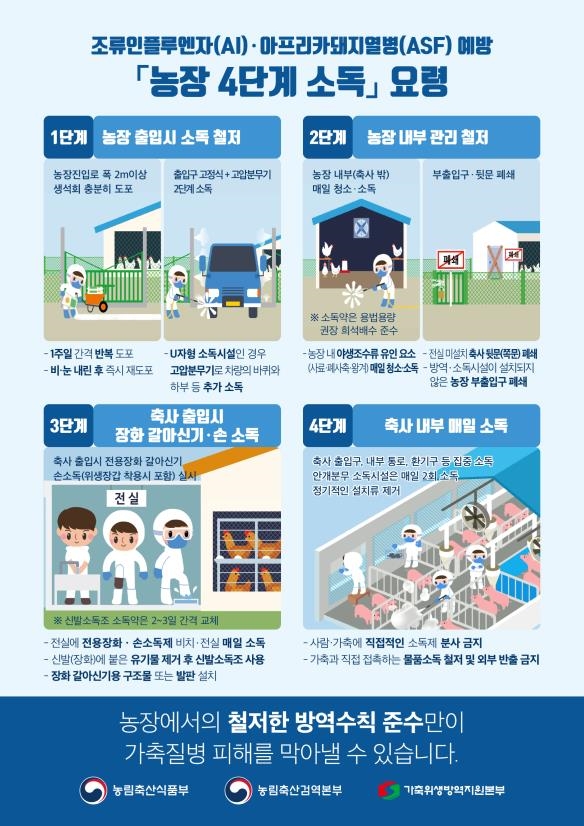 “농장과 축사 내 오염원 유입 차단을 위해 출입차량 2중소독(고정식+고압분무)을 포함한 농장 4단계 소독, 계란 상차장소 방역관리, 소독·방역 시설이 없는 농장 부출입구·축사 쪽문 폐쇄 등 방역수칙 준수와 차단방역을 철저히 실시하고”