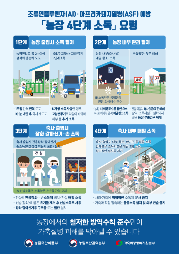 중수본은 “야생조류와 가금농장에서 고병원성 조류인플루엔자가 지속 검출되고 있는 위험한 상황으로, 가금농가에서는 경각심을 가지고 출입차량 2중 소독(고정식+고압분무)을 포함한 농장 4단계 소독, 소독·방역 시설이 없는 농장 부출입구·축사 쪽문 폐쇄 등 방역수칙 준수와 차단방역을 철저히 실시해 줄 것”을 강조하였다.