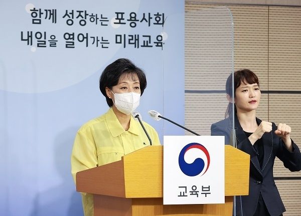 박순애 사회부총리 겸 교육부 장관이 4일 정부세종청사에서 ‘2022학년도 2학기 유·초·중등 및 특수학교와 대학의 방역·학사 운영방안’을 브리핑하고 있다. (사진=교육부)