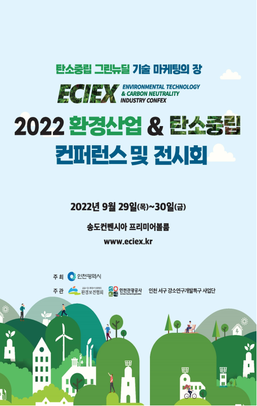[인천/이광일기자] 인천광역시(시장 유정복)가 주최하고, 인천관광공사(사장 민민홍)와 환경보전협회(회장 권한대행 김혜애), 인천서구 강소연구개발특구 사업단(단장 인천대학교 교수 이희관)이 공동 주관하는 『2022 환경산업&탄소중립 컨퍼런스 및 전시회(ECIEX)』가 오는 9월 29일부터 30일까지 양일간 송도컨벤시아에서 개최된다.