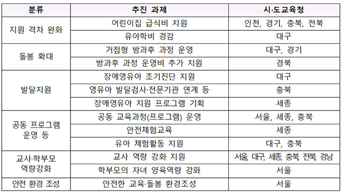 또 어린이집 급식비 지원, 유치원·어린이집 공동 교육과정 운영 등 13개 과제에 총 482억 원(교육청 424억 원·지자체 58억 원)을 지원받는다.