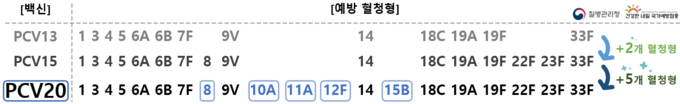새롭게 접종이 시작되는 PCV20은 기존 PCV15에 포함된 15종의 예방 혈청형에서 5종(8, 10A, 11A, 12F, 15B)을 더해 총 20종의 폐렴구균 혈청형을 예방할 수 있다.