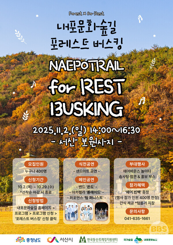 충남도와 사단법인 내포문화숲길은 다음 달 2일 오후 2시 서산 보원사지 일원에서 ‘내포문화숲길 포레스트 버스킹’ 행사를 개최한다고 16일 밝혔다.