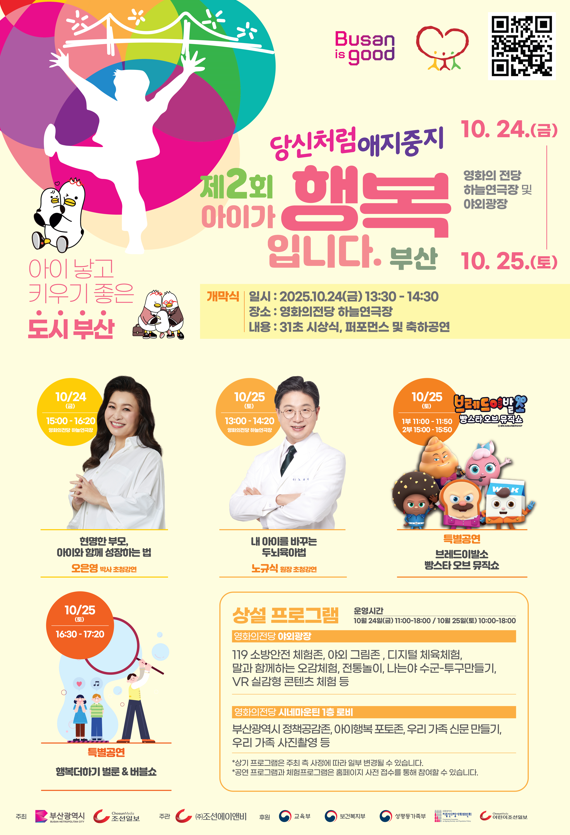 [부산/문종덕기자] 부산시(시장 박형준)는 내일(24일)과 25일 양일간 영화의전당 하늘연극장 및 야외광장에서 저출생 대응 캠페인 당신처럼 애지중지 '제2회 아이가 행복입니다. 부산'을 개최한다고 밝혔다.