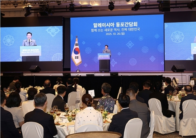 이재명 대통령이 26일 말레이시아 쿠알라룸푸르 한 호텔에서 열린 동포 만찬 간담회에서 인사말을 하고 있다. 2025.10.26 (사진=연합뉴스)