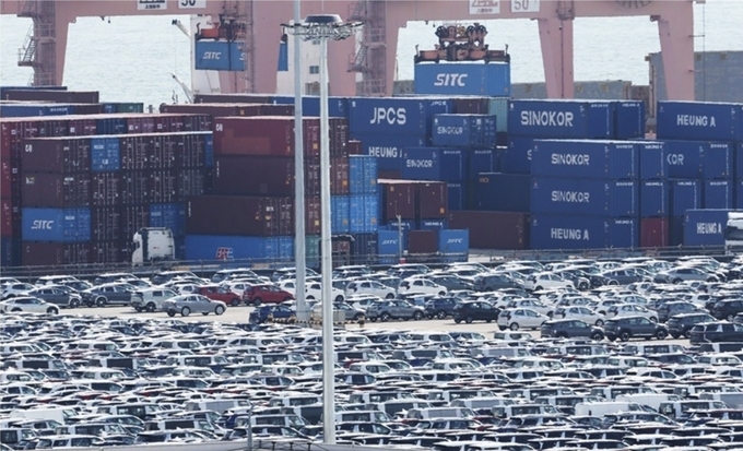 사진은 16일 경기도 평택항에 수출 대기 중인 자동차 뒤로 컨테이너가 쌓여 있는 모습. 2025.10.16 (사진=연합뉴스)