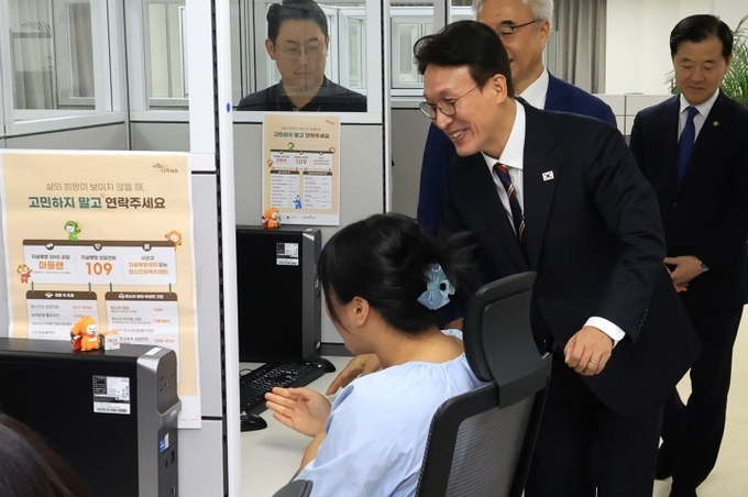 김민석 국무총리가 지난 9월 12일 서울 중구 자살예방상담 시설인 한국생명존중희망재단을 방문해 전화 상담사를 격려하고 있다. 2025.9.12. (ⓒ연합뉴스)