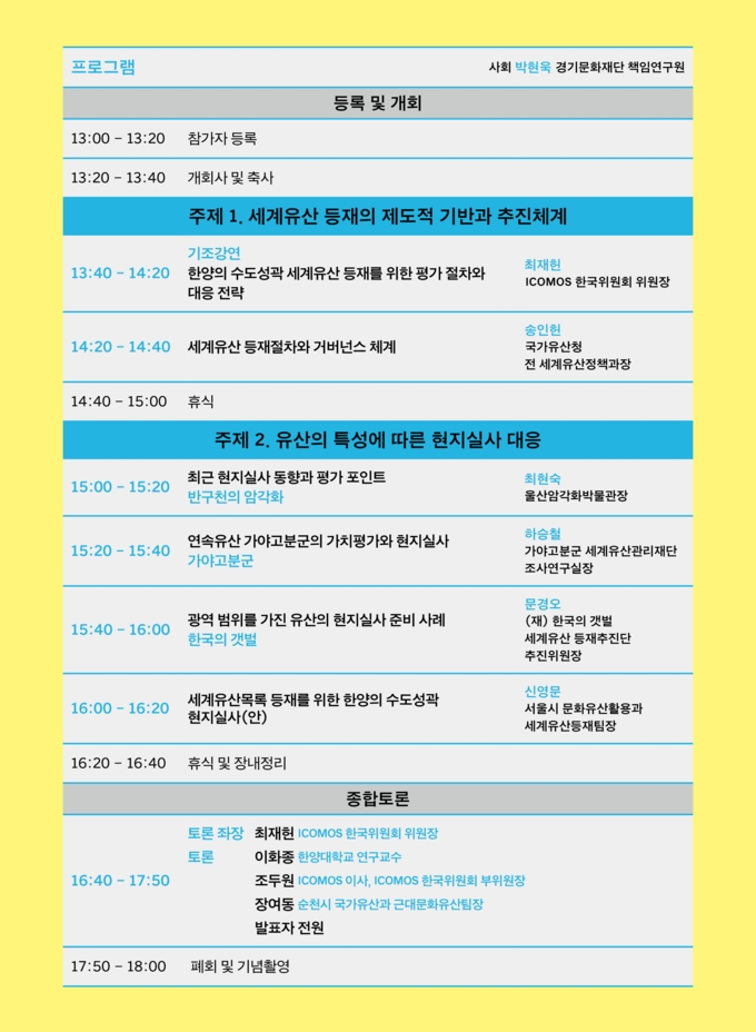 주제 발표 후에는 ▴조두원(이코모스 이사, 이코모스 한국위원회 부위원장) ▴이화종(한양대학교 연구교수) ▴장여동(순천시 국가유산과 근대문화유산팀장) 등 세계유산 등재 및 평가 과정에 직접 참여한 전문가들이 발표자들과 함께 토론을 이어 나간다. 특히 <한양의 수도성곽>의 현지실사 계획을 점검하여, 평가자의 관점에서 놓치기 쉬운 세부 요소를 보완하는 데 집중할 예정이다. 학술회의에서 논의된 내용은 향후 서울시의 세계유산 등재 준비 과정에도 적극 반영될 예정이다.