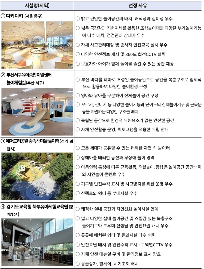 ‘우수 어린이놀이시설’은 어린이 안전에 대한 국민적 관심을 높이고 안전한 놀이시설 설치를 장려하기 위해 2012년부터 매년 선정해 왔으며, 지난해까지 총 109개소가 지정됐다.