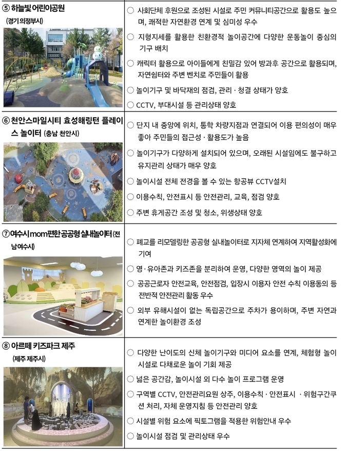 올해에는 전국 8만 4천여 개의 어린이놀이시설 중 시도 및 시도 교육청에서 추천한 46개 시설을 대상으로, 전문가·현장 심사*를 거쳐 최종 8곳을 선정했다.