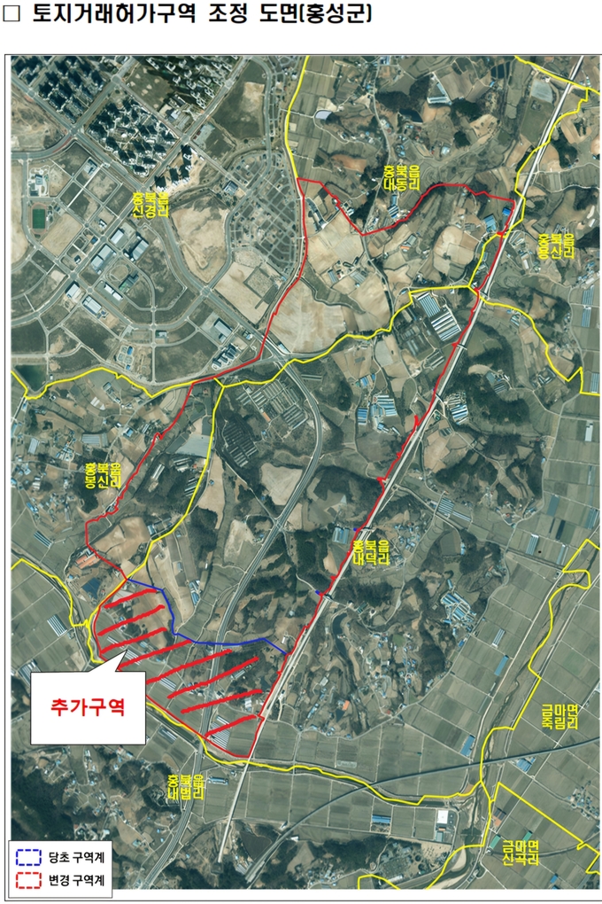 홍성군은 지난 2023년 3월 25일부터 5년 동안 홍북읍 내덕리 일원 1179필지 235만 6000㎡를 허가구역으로 지정한 데 이어 이번 조정으로 2개 리 440필지 45만 3000㎡를 추가했다.
