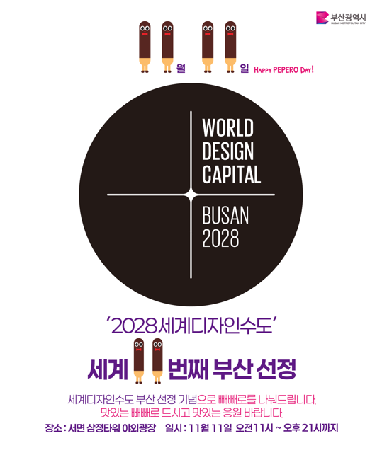 [부산/문종덕기자] 부산시(시장 박형준)는 내일(11일) 오전 11시부터 오후 9시까지 삼정타워 야외광장(부산진구 부전동)에서 롯데웰푸드와 「빼빼로데이(11의 날)×11번째 세계디자인수도 부산 2028」 공동 캠페인을 개최한다고 밝혔다.