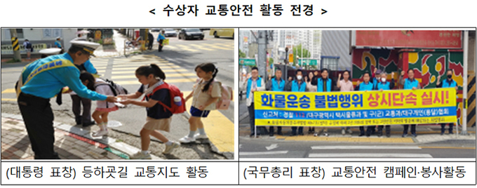 국무총리표창은 39년 동안 화물운송에 종사하며 교통안전 캠페인·봉사활동 등 안전한 운송환경 조성에 노력한 대구개인용달화물 자동차운송사업협회 이목희 씨 등 9명이 받는다.