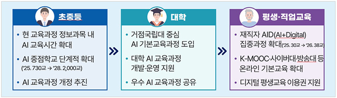 이에 인공지능 중점학교를 올해 730개에서 2028년까지 2000교로 단계적으로 확대하고, 인공지능 관련 대학·대학원 정원을 확대한다.