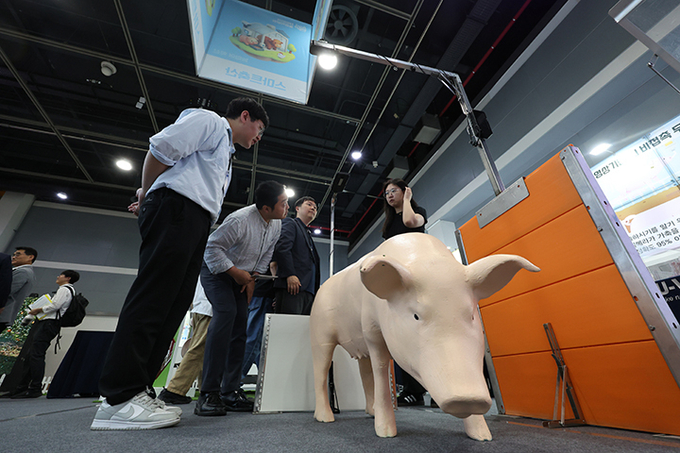 25일 서울 서초구 aT센터에서 열린 '2025 대한민국 농업박람회'의 스마트축산관에서 참관객이 거치형 양돈 체중 관리기에 대한 설명을 듣고 있다. 2025.9.25(사진=연합뉴스)