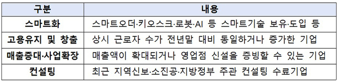 키오스크 등 스마트기술 도입내역을 제출하거나 고용 근로자가 증가하는 등 경쟁력 강화계획을 입증할 수 있는 소상공인이 신청대상이다.