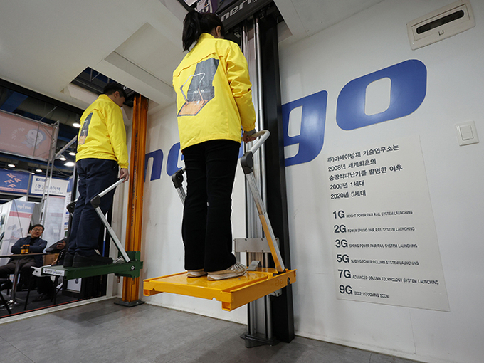 지난 5일 서울 강남구 코엑스에서 열린 '한국건축산업대전 2025'에서 부스 관계자가 승강식 피난기를 시연하고 있다.(사진=연합뉴스)