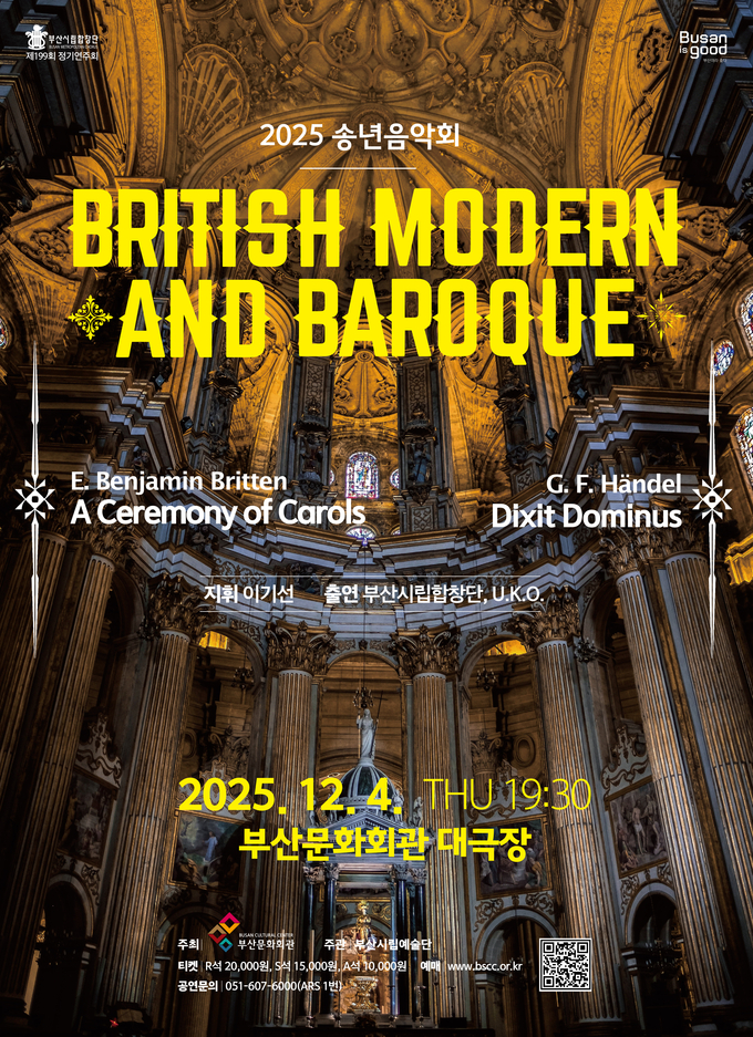이번 무대는 영국음악을 대표하는 두 거장, 벤저민 브리튼과 헨델의 작품을 통해 현대음악과 바로크의 예술적 조화를 한 무대에서 조명하며, 한 해를 마무리하는 감사와 축복의 메시지를 전한다. 지휘는 이기선이 맡고, 연주는 부산시립합창단과 유나이티트코리안오케스트라(U.K.O), 협연에는 하프 정주희, 오르간 김지연이 함께한다.