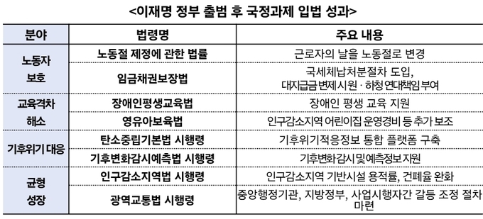 주요 입법성과를 살펴보면, 노동자보호, 교육격차 해소, 기후위기 대응, 균형성장 등 다양한 분야에서 입법이 추진되었고, 사회적 약자를 보호하는 법률도 다수 포함되어 있다.