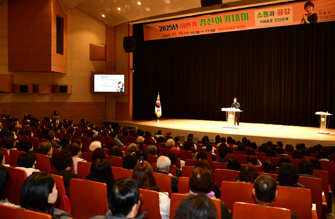 [경산/김근해기자] 경산시(시장 조현일)는 19일 경산시민회관 대강당에서 시민 600여 명이 참여한 가운데 『2025년 하반기 경산 아카데미』를 성황리에 개최했다. 이번 경산 아카데미는 숭실사이버대학교 학과장 이호선 교수를 초청하여‘소통과 공감, 지혜로운 인간관계’라는 주제로 진행되었다.