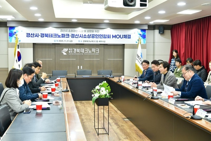 [경산/김근해기자] 경산시(시장 조현일)는 21일 경북테크노파크 세미나실에서 경북테크노파크, 경산시소상공인연합회와 함께 ‘소상공인 성장 지원 업무협약(MOU)’을 체결했다고 밝혔다.