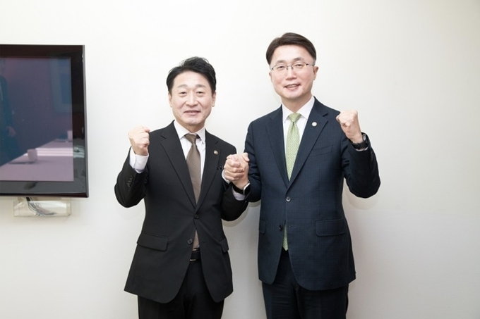 류제명 과학기술정보통신부 제2차관(오른쪽)과 이호현 기후에너지환경부 제2차관이 21일 오후 서울 중구 달개비에서 열린 '과기정통부-기후부 정책간담회' 에서 협력을 다짐하고 있다.(사진=과기정통부 제공)