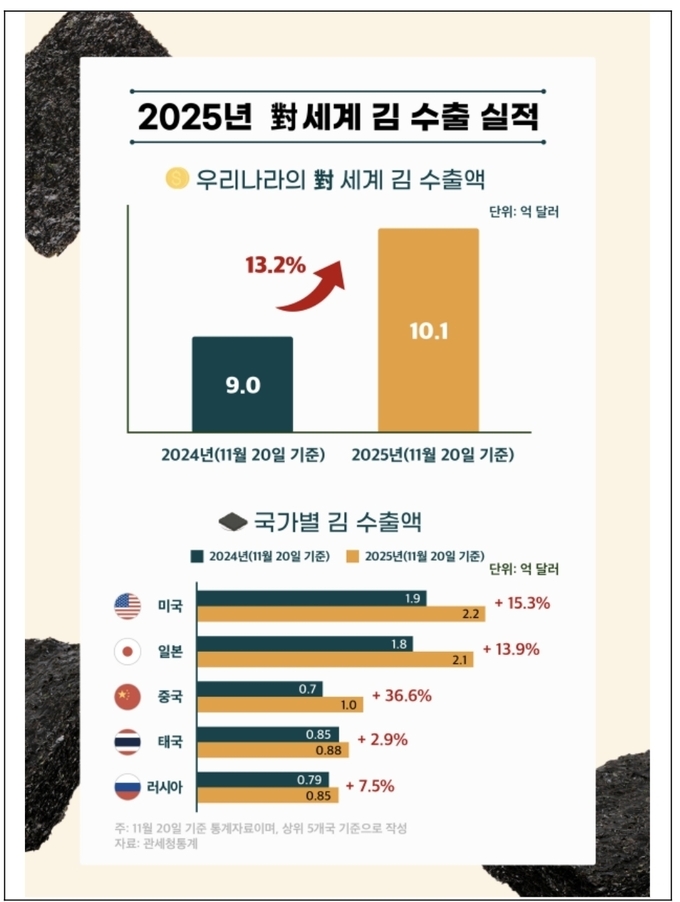 [한국방송/최동민기자] 해양수산부(장관 전재수)는 2025년 한국의 김 수출 실적이 역대 최초로 10억 불을 돌파했다고 밝혔다.