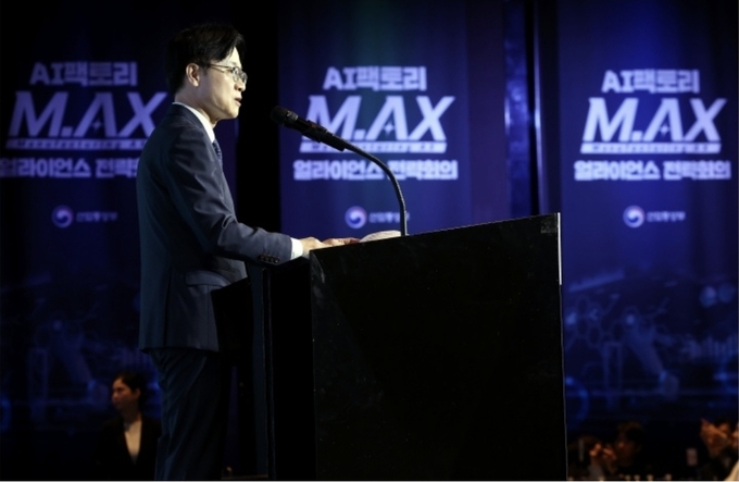 김정관 산업통상부 장관이 1일 오후 서울 중구 소공로 더 플라자 호텔에서 열린 제조 혁신을 이끄는 AI팩토리 M.AX 얼라이언스 전략회의에서 축사를 하고 있다. 2025.10.1 (ⓒ뉴스1)
