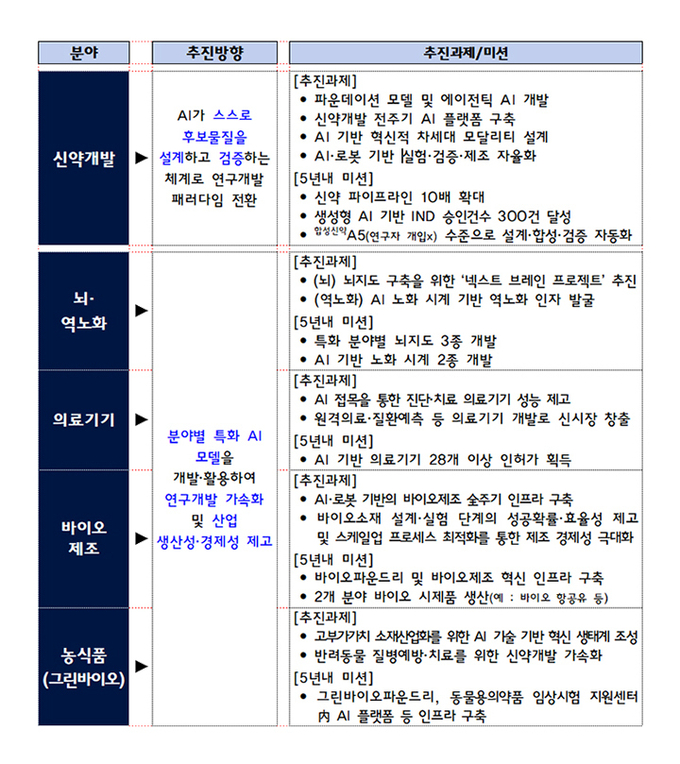 정부는 AI 적용 가능성과 파급효과를 고려해 단기 성과, 중장기 혁신, 국민 체감을 달성할 수 있게 신약개발, 뇌·역노화, 의료기기, 바이오제조, 농식품(그린바이오) 등 5대 핵심 분야를 선정하고 AI 바이오 모델을 구축한다.