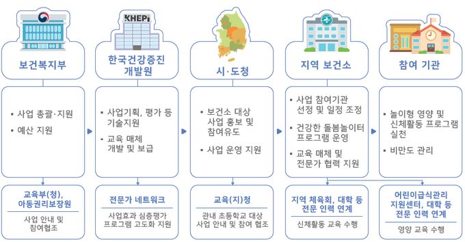 이에 보건복지부와 한국건강증진개발원은 초등학생 아동비만예방사업인「건강한 돌봄놀이터」사업을 ’18년부터 지속적으로 추진 중이다. 참여 아동들은 놀이형 영양교육과 신체활동 프로그램 등 건강한 생활습관 형성을 돕는 교육을 받았다. 2025년부터는 늘봄학교와 지역아동센터 뿐만 아니라 다함께 돌봄센터 등 아동복지시설까지 이용 아동까지 확대하였다.