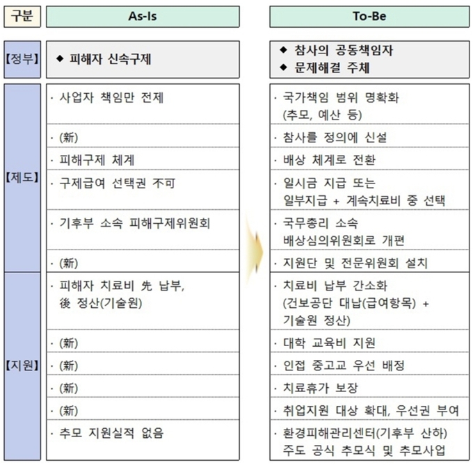 먼저 국가 주도 배상체계로 전환해 적극적 손해인 치료비와 소극적 손해인 일실이익과 위자료 등을 지급한다.