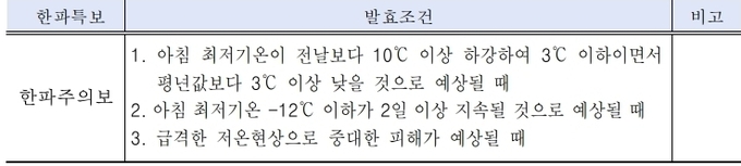 한파특보 중 ‘한파주의보’는 아침 최저기온이 영하 12도 이하인 날이 2일 이상 지속될 것으로 예상될 때, ‘한파경보’는 아침 최저기온이 영하 15도 이하인 날이 2일 이상 지속될 것으로 예상될 때 발효된다.