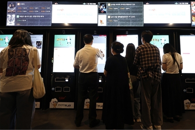 서울의 한 영화관을 찾은 관람객들이 키오스크를 통해 티켓을 출력하고 있다.2025.9.8.(ⓒ뉴스1)