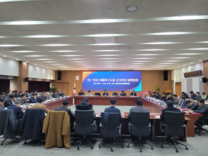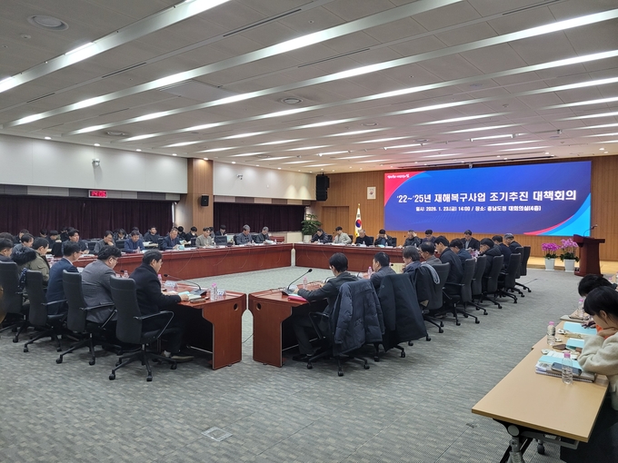 도는 23일 도청 대회의실에서 신일호 안전기획관 주재로, 도 관련 부서 및 시군 과장들이 참석한 가운데 ‘재해복구사업 조기 추진 대책회의’를 개최했다.