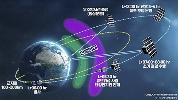 'K-라드큐브'는 지구 고궤도 사출 이후 해외 지상국과 초기 교신을 수행하며 지상국 관제에 따라 임무 궤도 도달을 위한 단계별 자체 추력 기동에 돌입한다.