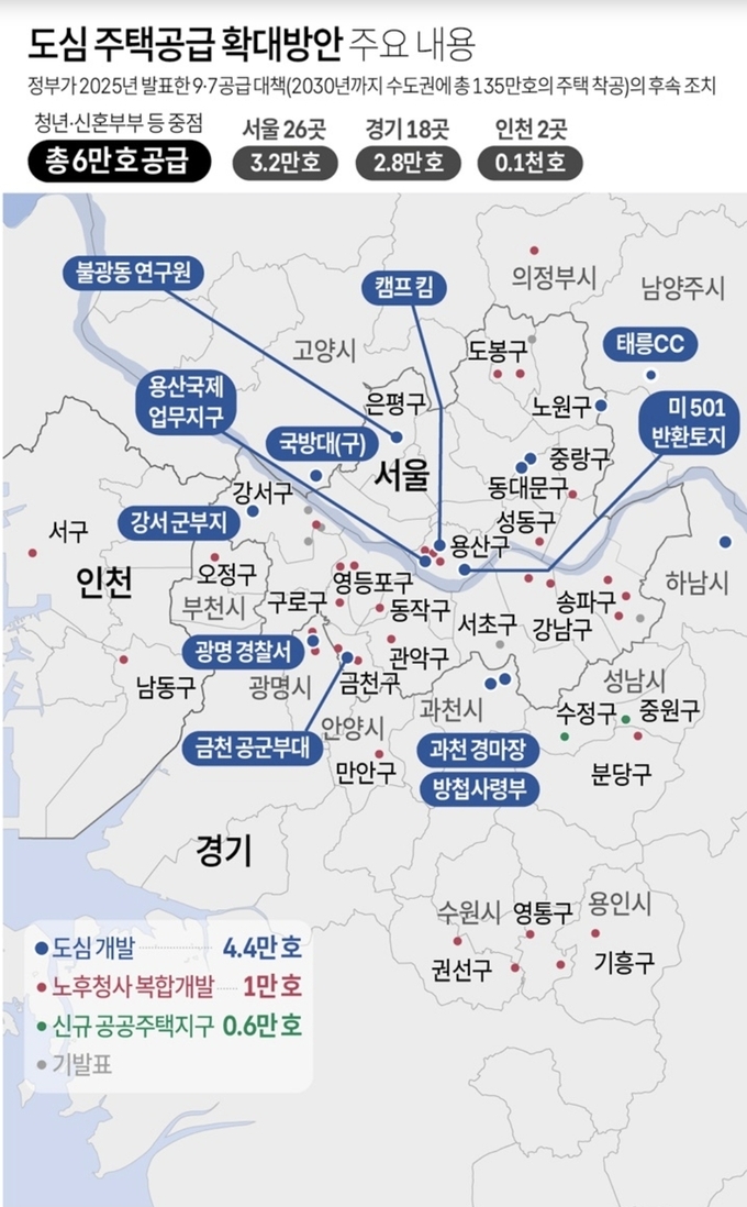 서울 용산국제업무지구, 태릉CC, 경기 과천 경마장·방첩사령부 이전 부지 등 수도권 핵심 입지를 활용해 총 6만 호 규모의 주택 공급이 추진되는 이번 계획은 청년과 신혼부부 등 주거 취약계층에게 접근성 좋은 도심에서 안정적인 주거를 지원하는 것이 목적이다.