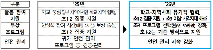 한편 교육부와 17개 시도교육청은 온동네 초등돌봄·교육 정책이 현장에 빠르게 안착되어 학생과 학부모가 오는 3월부터 정책의 혜택을 누릴 수 있도록 지난해 12월부터 2026학년도 운영을 준비하고 있다.