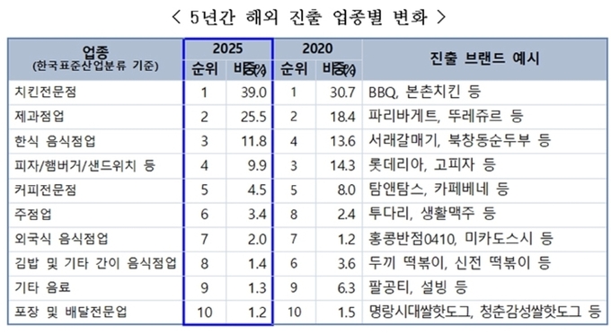 업종별로는 치킨 전문점(1809개)과 제과점(1182개)이 전체 해외 매장의 약 64%를 차지했다.