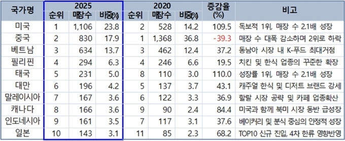 2020년 1위였던 중국은 매장 수가 1368개에서 830개로 감소했다. 베트남은 634개 매장으로 3위를 유지했다.