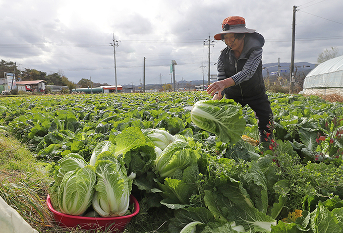 11일 오후 충남 청양군 비봉면 한 배추밭에서 농민이 작물을 수확하고 있다. 2021.11.11 (사진=연합뉴스)