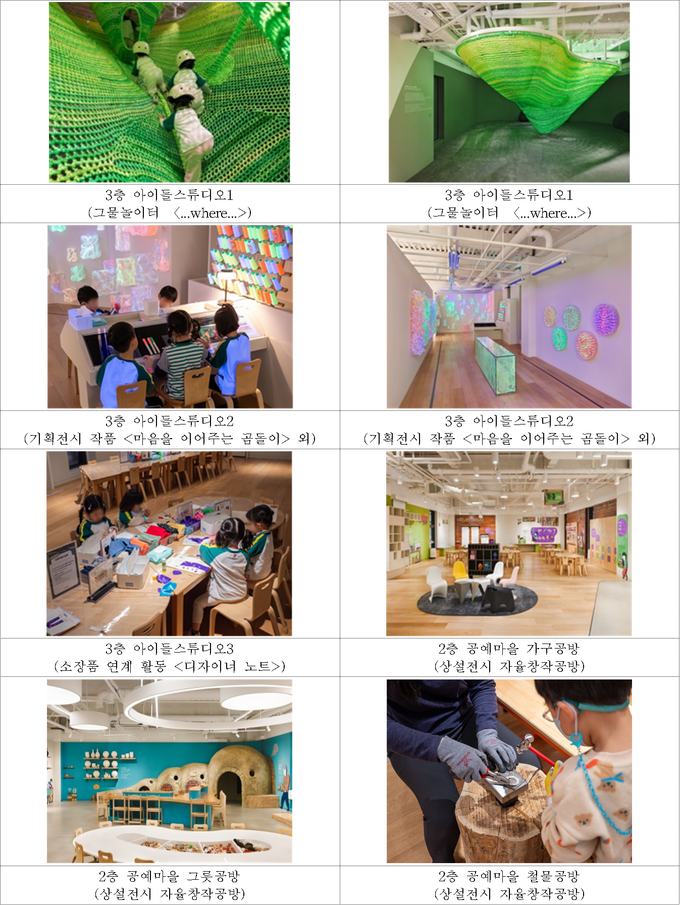이번 개편을 통해 조성된 ▲2층 창작공간《공예마을(Craft Village)》과 ▲3층 감상공간《아이들스튜디오(IDLE Studio)》에서는 9세 이하 어린이를 대상으로 한 체험형 전시, 공예 창작활동, 워크숍이 운영된다. 한 번의 예약으로 어린이박물관 2~3층의 상설·기획전시, 창작활동, 워크숍을 모두 이용할 수 있다.