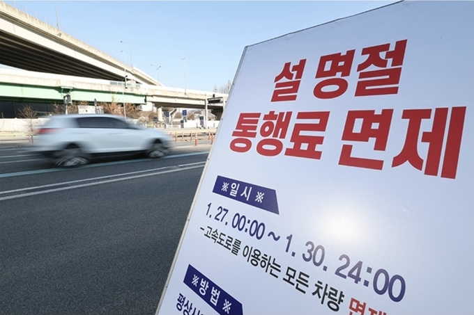 국토교통부는 '설연휴 특별교통대책'에 따라 오는 15일부터 18일까지 4일간 전국 고속도로(민자고속도로 포함) 통행료를 전면 면제한다. 사진은 지난해 경기 용인시 기흥구 경부고속도로 수원신갈IC에 설 명절 통행료 면제 안내판이 설치돼 있다.(ⓒ뉴스1)