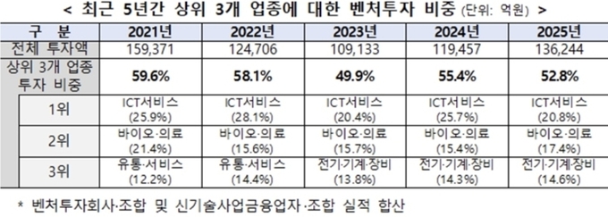 업종별로는 ICT서비스(20.8%), 바이오·의료(17.4%), 전기·기계·장비(14.6%)가 상위 3개 업종으로 전체 투자 금액의 52.8%를 차지했다.