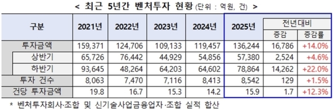 2025년 신규 벤처투자 금액은 13조 6000억 원으로, 전년 대비 1조 7000억 원 증가했다. 2021년 15조 9000억 원에 이어 두 번째로 높은 수준이다.