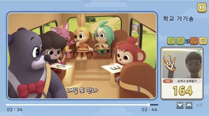 잼잼400을 플레이하는 모습. 아이는 '손목 펴고 손목 들기' 등 자신에게 지정된 동작을 반복해야 영상을 볼 수 있다. 동작을 멈추면 영상도 멈춘다. 화면 오른쪽 아래로 아이의 손마디 움직임이 인식되고 있다. 사진 잼잼테라퓨틱스